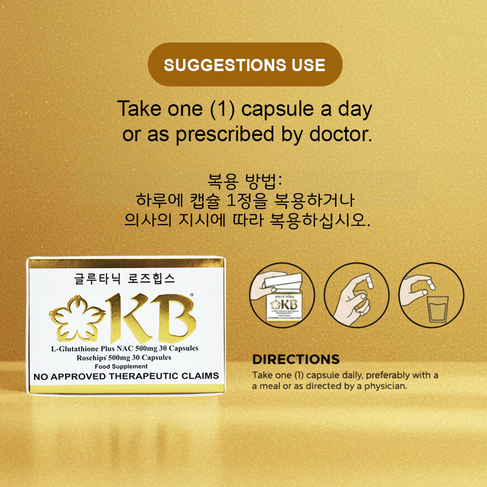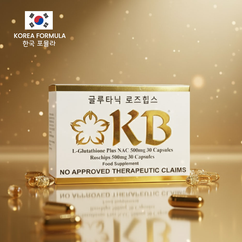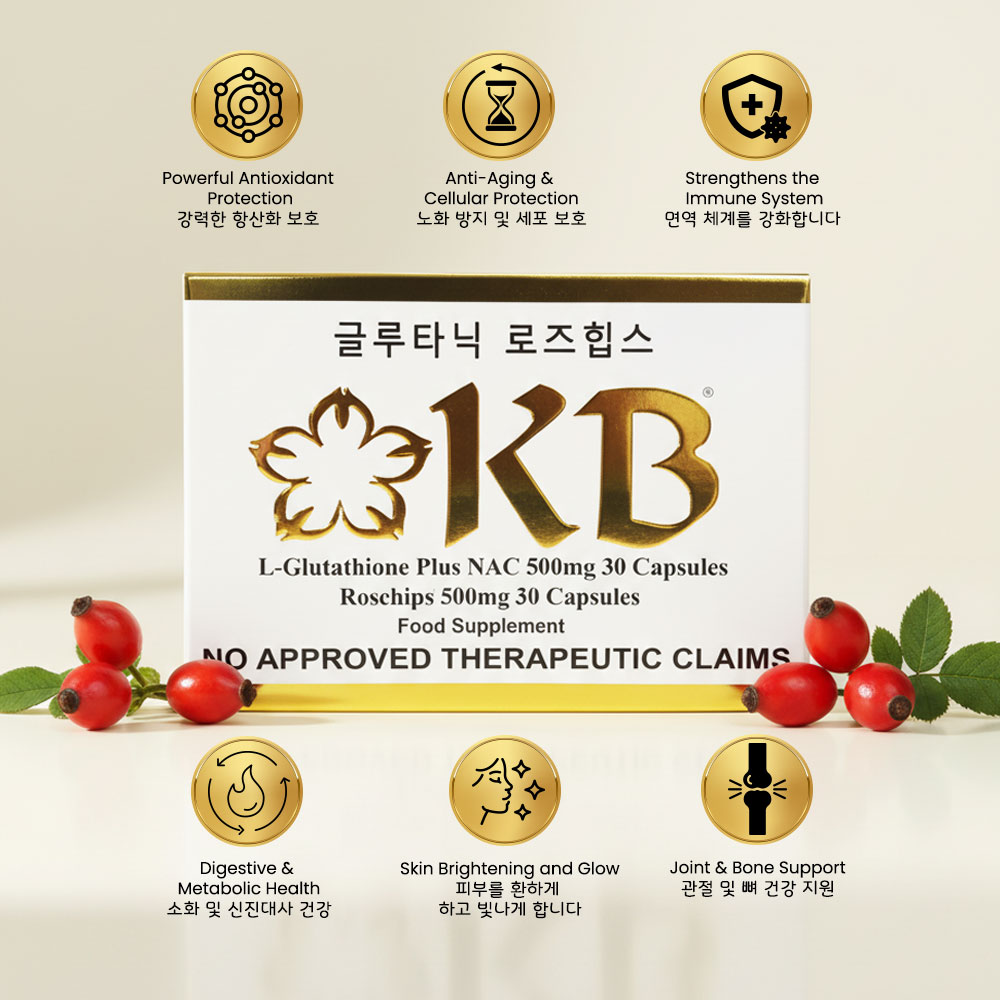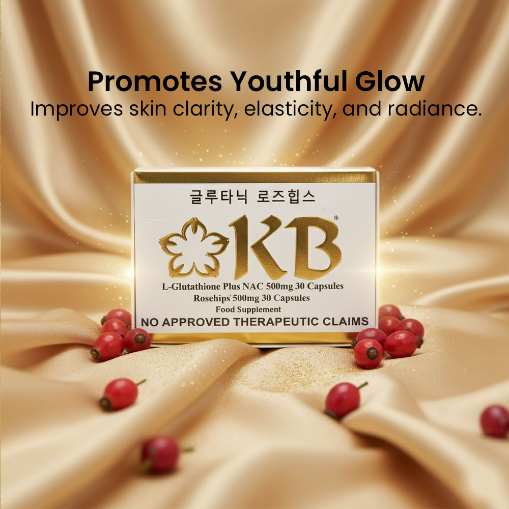 KB Glutathione + KB Rosehips is a dietary supplement formulated to promote brighter, healthier, and more youthful-looking skin. It combines the powerful antioxidant L-Glutathione with Rosehips extract, a rich source of Vitamin C, to help detoxify the body and enhance the natural skin-whitening process.