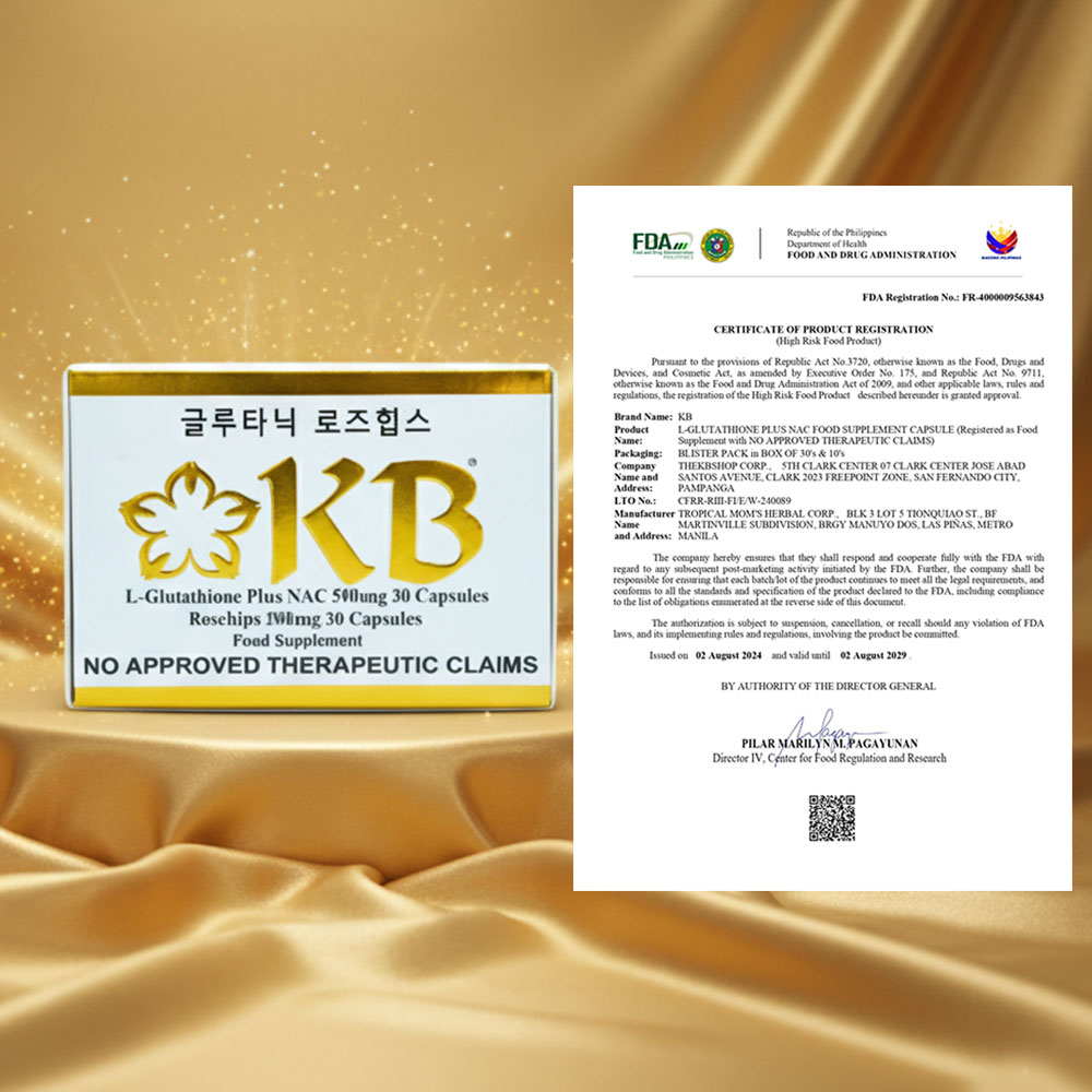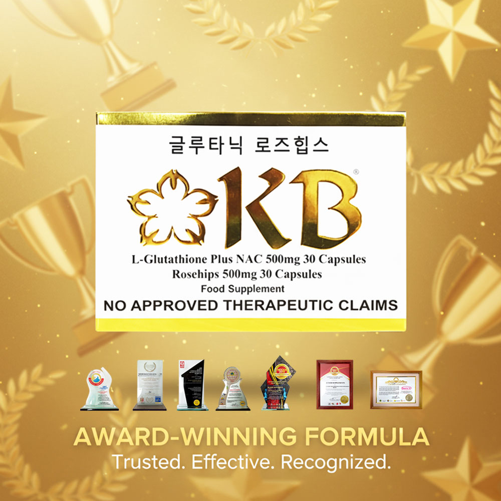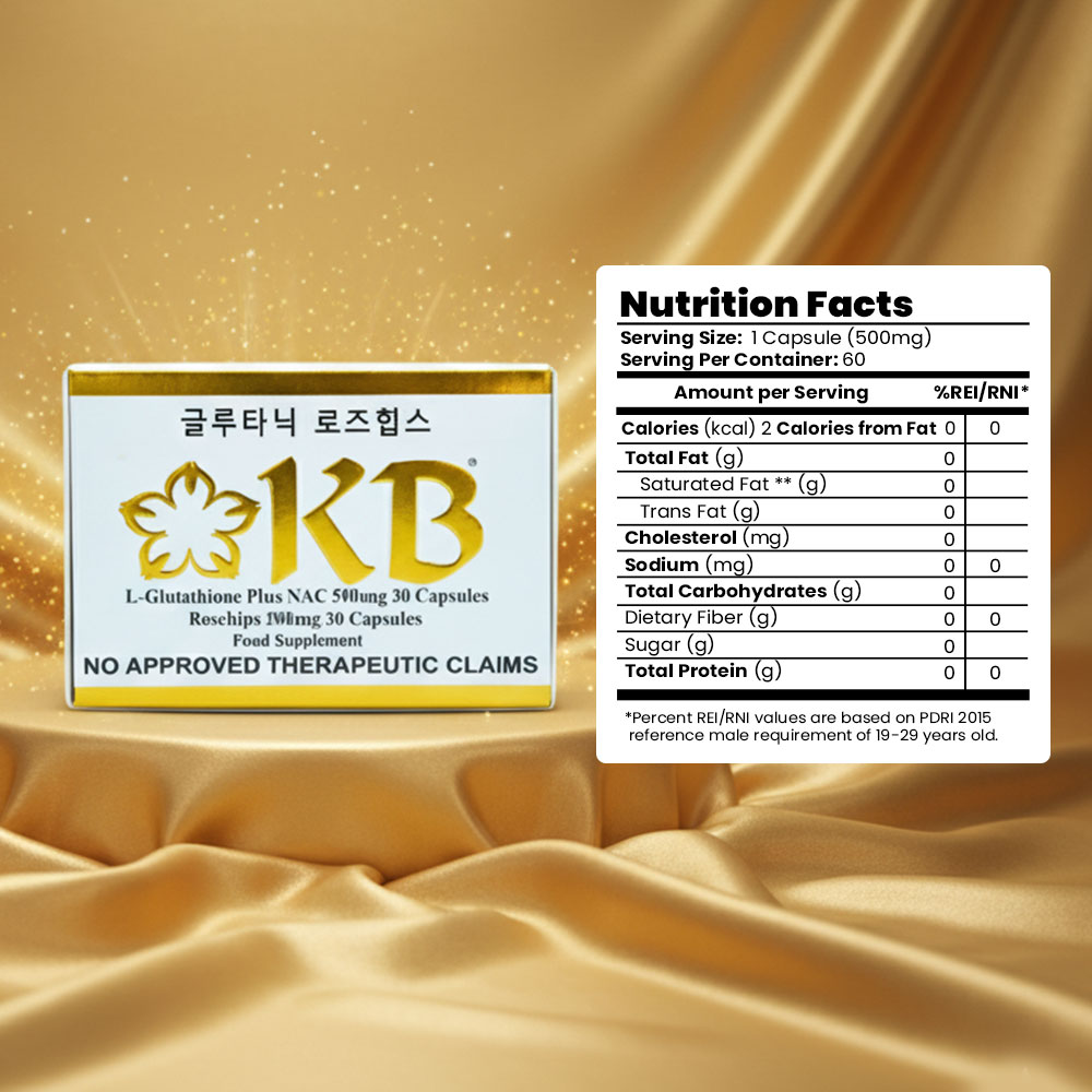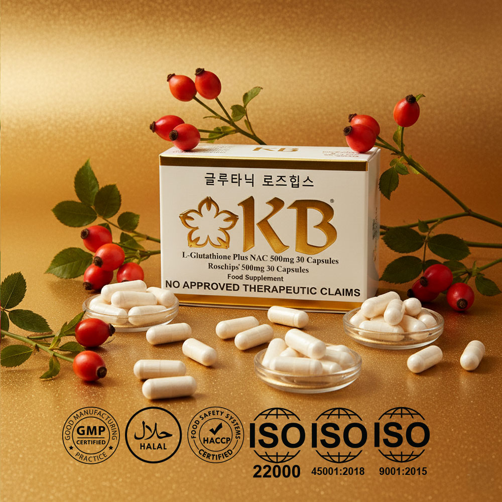 KB Glutathione + KB Rosehips is a dietary supplement formulated to promote brighter, healthier, and more youthful-looking skin. It combines the powerful antioxidant L-Glutathione with Rosehips extract, a rich source of Vitamin C, to help detoxify the body and enhance the natural skin-whitening process.