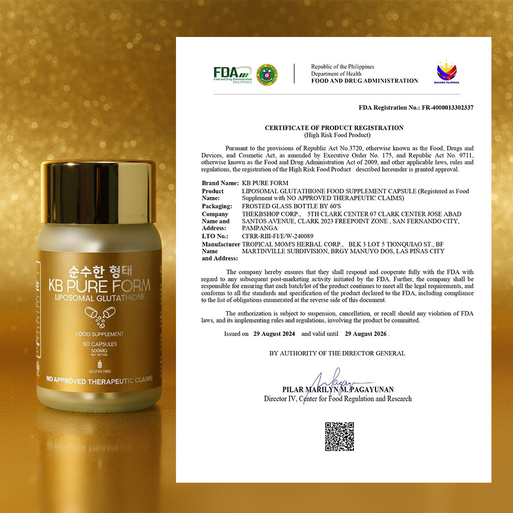 Yes, KB Pure Form Masshiro Liposomal Glutathione is FDA approved in the Philippines, ensuring it meets the quality and safety standards set by regulatory authorities.