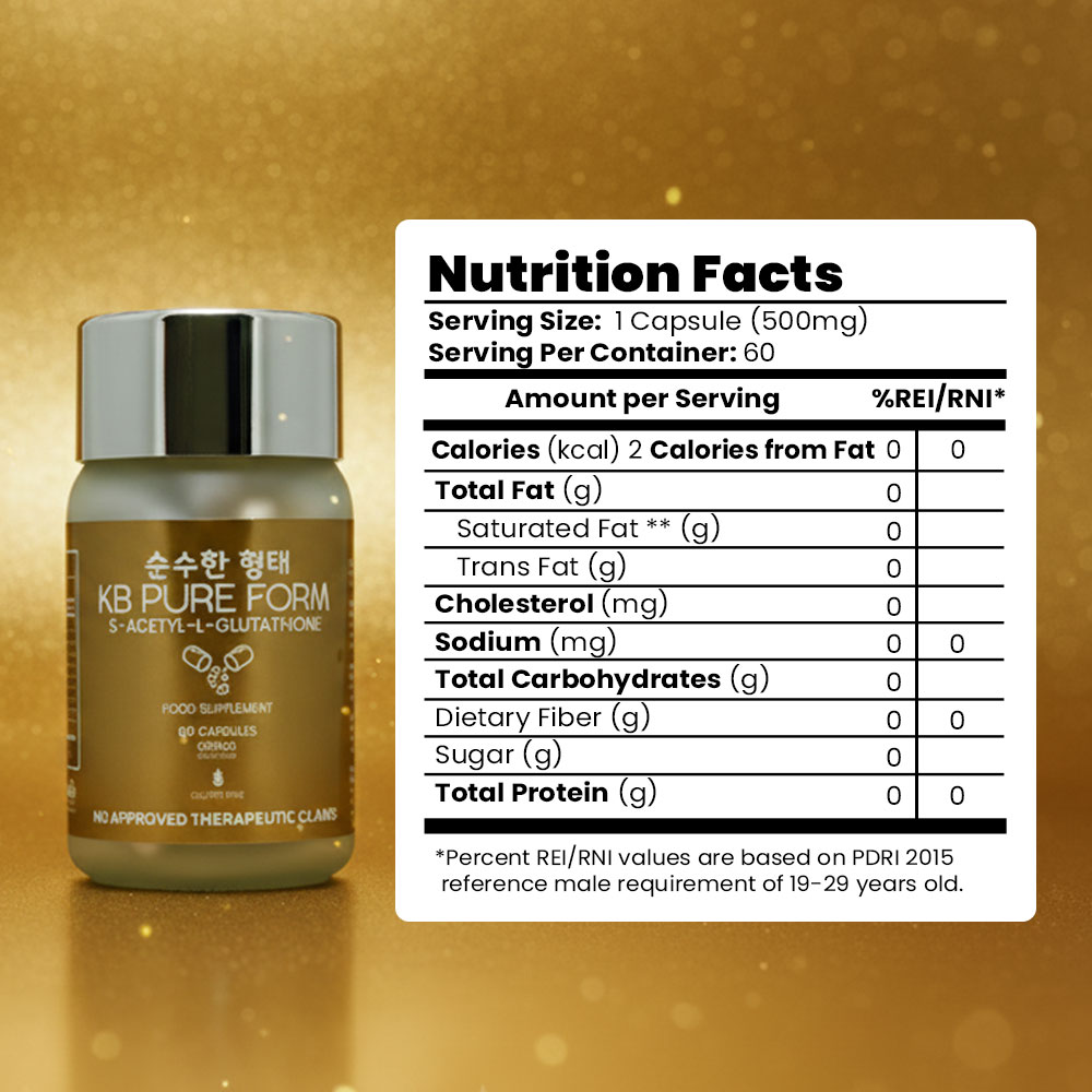KB Pure Form S-Acetyl-L-Glutathione is a premium form of S-Acetyl-L-Glutathione (SAG), a stabilized and bioavailable version of glutathione, a powerful antioxidant naturally produced in the body. Unlike regular glutathione, S-Acetyl-L-Glutathione is protected by an acetyl group, making it more effective and stable in the body, ensuring better absorption and longevity.