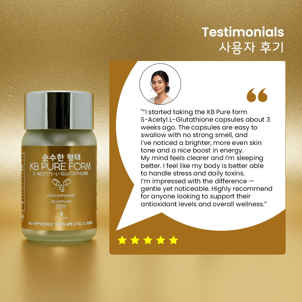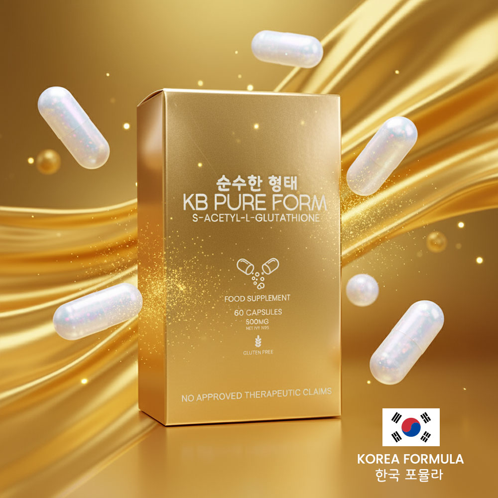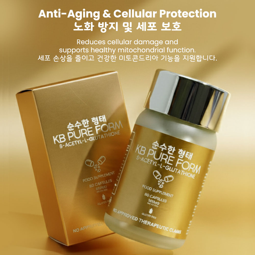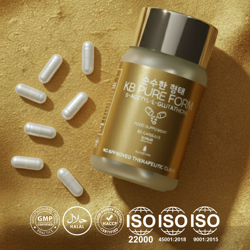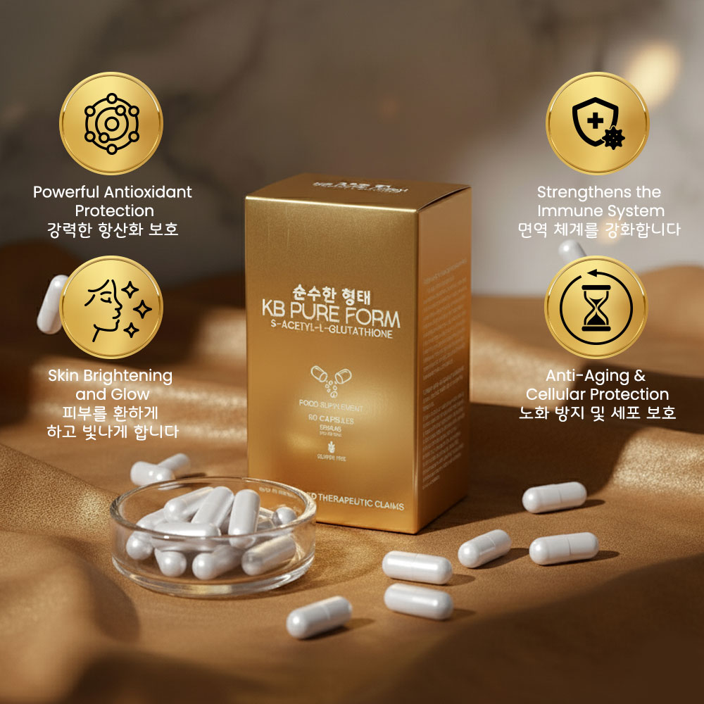 KB Pure Form S-Acetyl-L-Glutathione is a premium form of S-Acetyl-L-Glutathione (SAG), a stabilized and bioavailable version of glutathione, a powerful antioxidant naturally produced in the body. Unlike regular glutathione, S-Acetyl-L-Glutathione is protected by an acetyl group, making it more effective and stable in the body, ensuring better absorption and longevity.