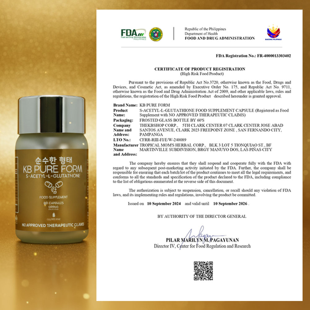 Yes, KB Pure Form S-Acetyl-L-Glutathione is FDA approved in the Philippines. You can trust that this product meets the highest safety and quality standards for your health.