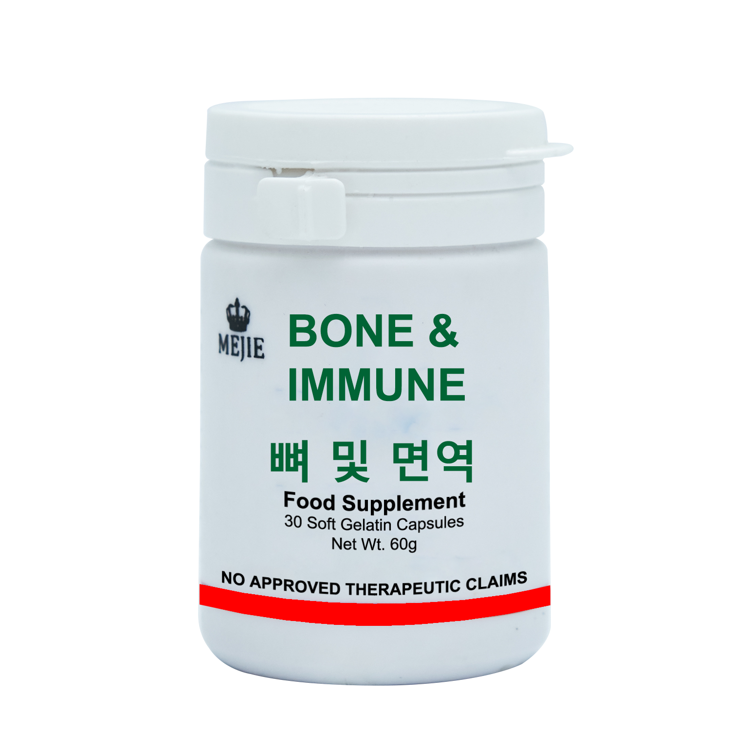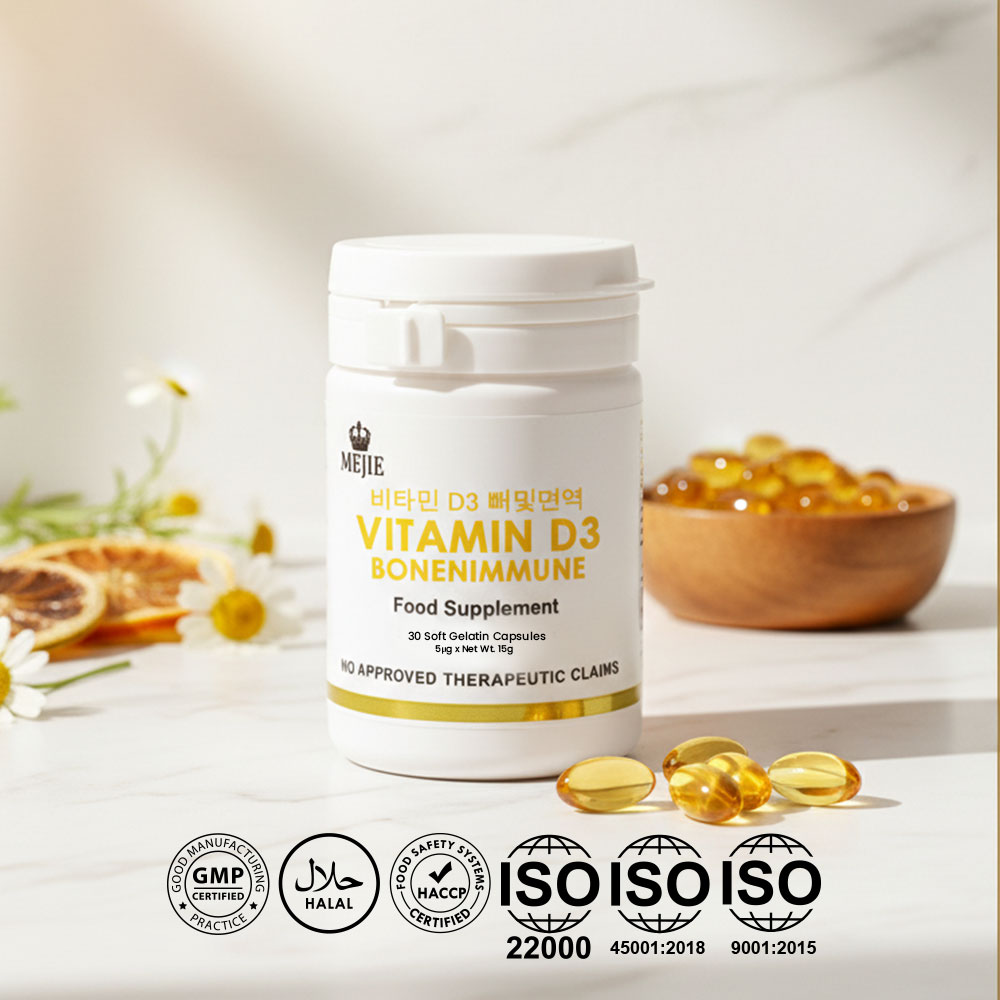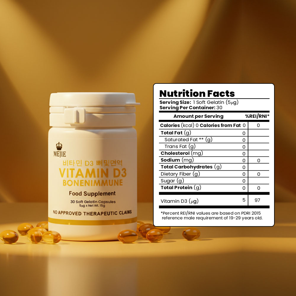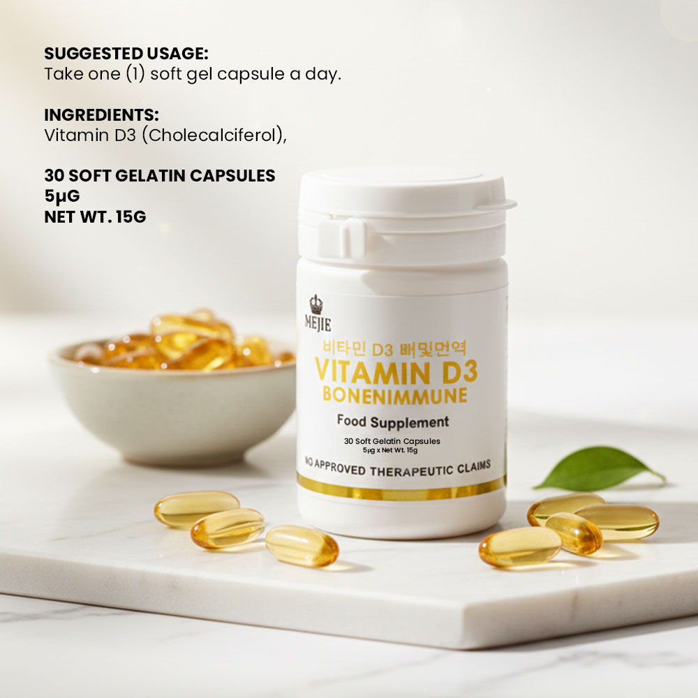 Mejie Bone and Immune with Vitamin D3 is a dietary supplement designed to support bone health and enhance the immune system. Each soft gelatin capsule typically contains 5000 IU (International Units) of Vitamin D3, which is crucial for various bodily functions, especially related to bone density and immune response.