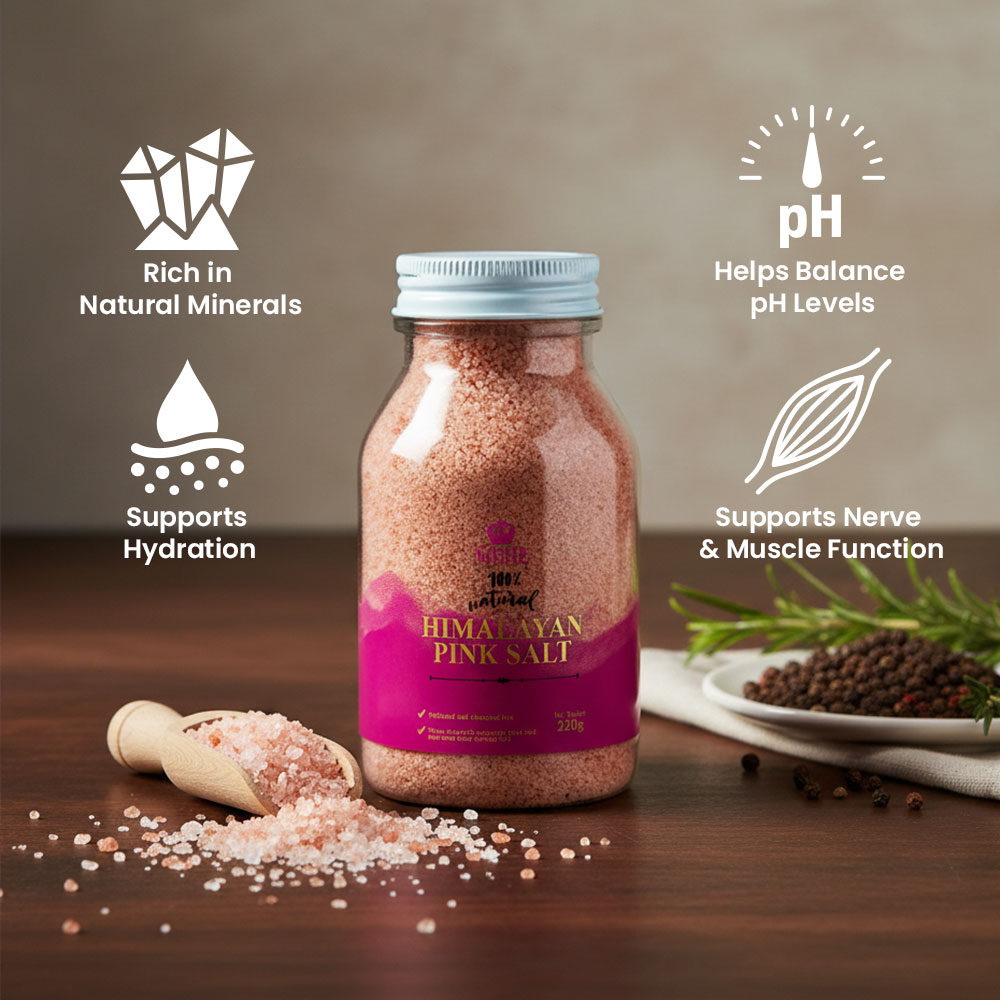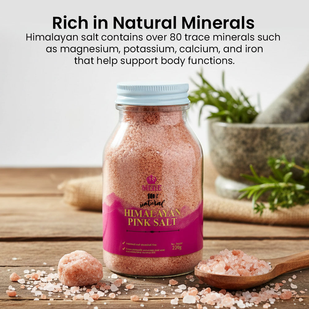 MEJIE Himalayan Pink Fine Salt is a type of salt that is harvested from the Khewra salt mine in the Himalayan region. It is known for its distinctive pink color, which comes from the minerals and trace elements it contains, such as iron, magnesium, and calcium. This salt is often marketed as a healthier alternative to regular table salt due to its mineral content and is commonly used in cooking, seasoning, and as a finishing salt.