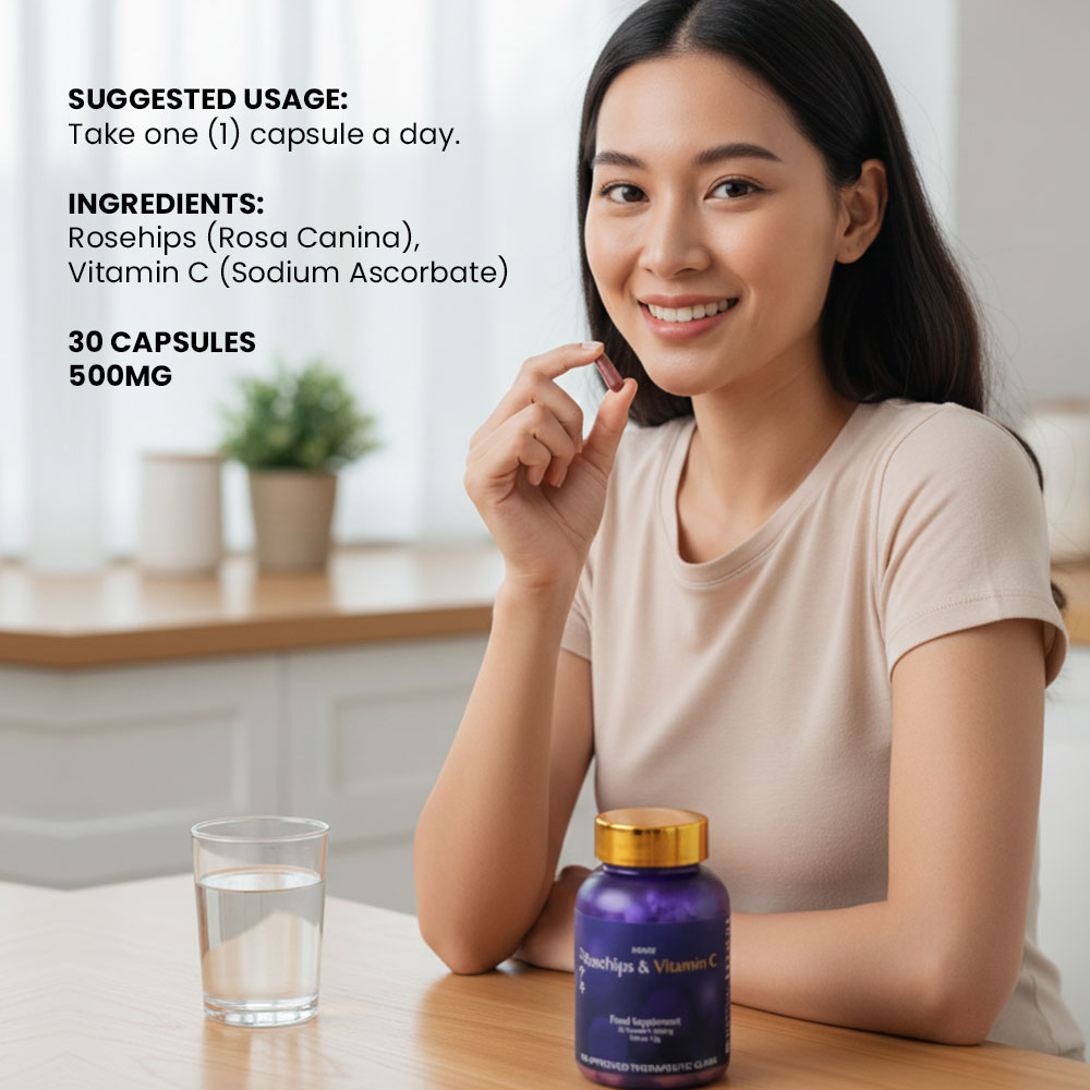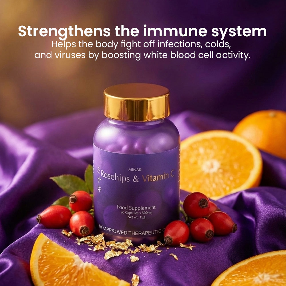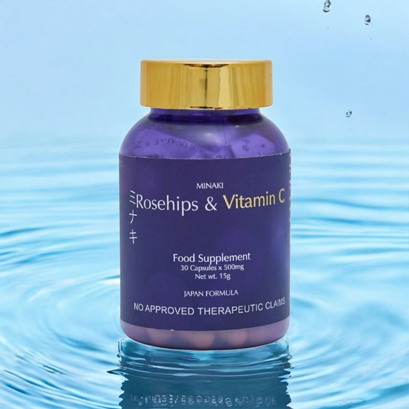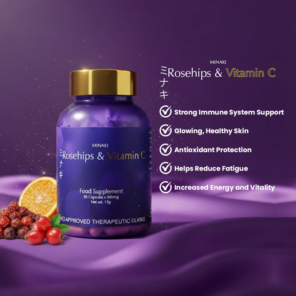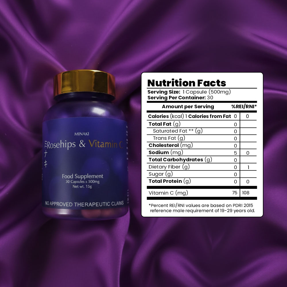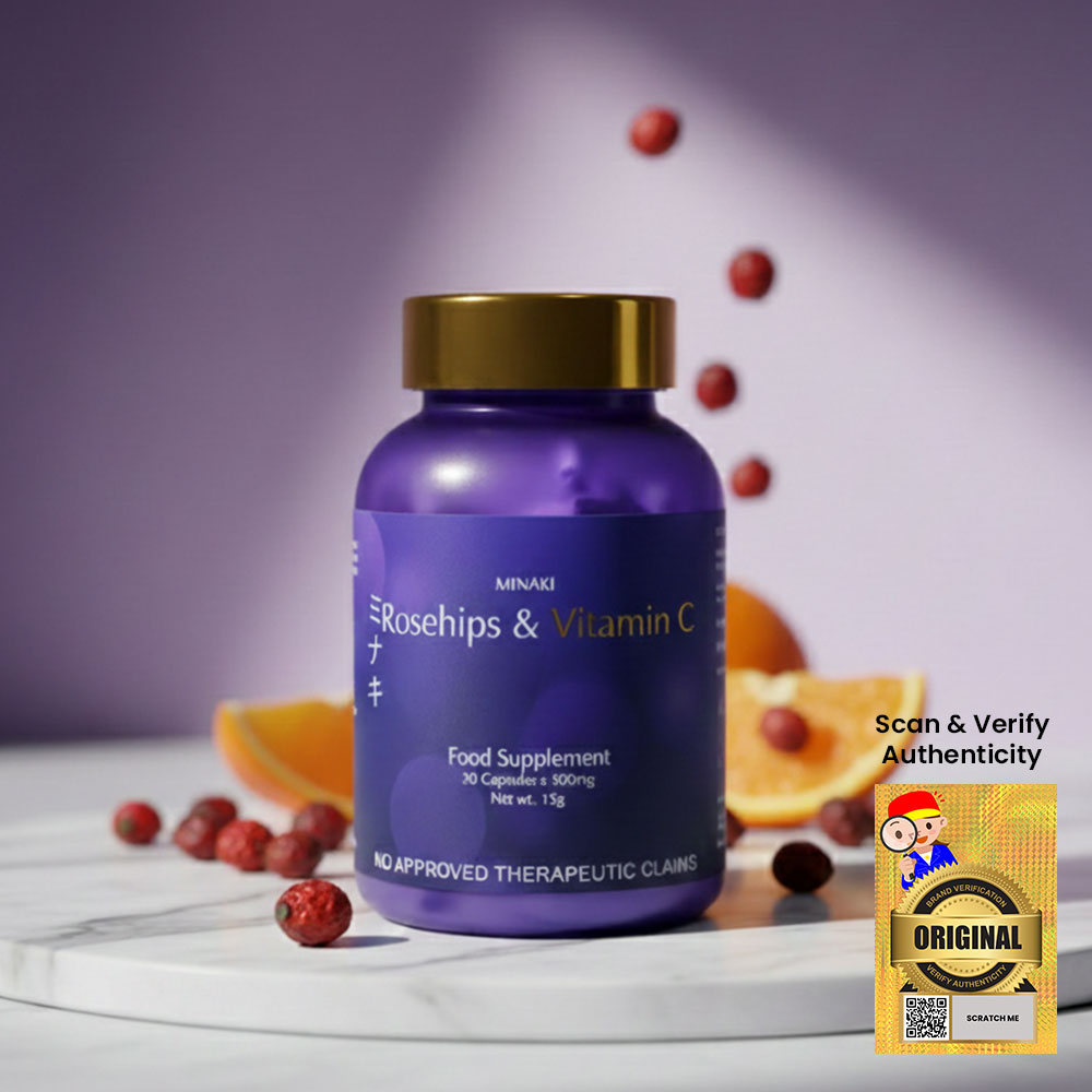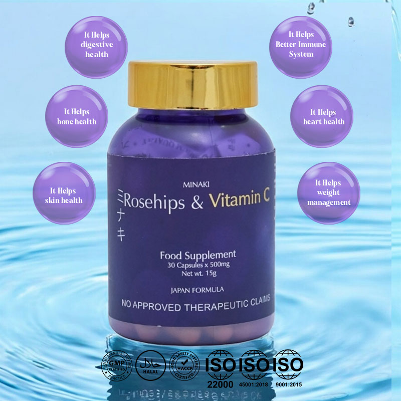 Minaki Rosehips & Vitamin C supplement provides a range of health benefits that support overall wellness. Metabolism and Energy: The supplement promotes a healthy metabolism and provides an energy boost. Immune System Support: The high levels of Vitamin C in rosehips strengthen the immune system. Bone and Eye Health:Rosehips are rich in antioxidants that promote bone health. They also contain lutein, which is beneficial for eye health. This gluten-free, GMO-free supplement is made with high-quality rosehips sourced from Japan. Each pack includes 30 capsules with 500mg of Vitamin C per capsule, making it suitable for adult use. Pack Type: The product comes as a single item pack. Age Range: This product is recommended for adults only . The FDA registered Minaki Rosehips & vitamin C supplement has an FDA Registration No.FDAPhilippines.Its Net Weight is 15g per pack.The flavor profile includes the natural taste of rosehip berries.The product has many Ingredient Features including being Gluten-Free,GMO-Free,Halal,and Healthier Choice certified to cater to your dietary preferences and needs.Elevate your overall wellness by adding this Minaki’s Rosehip & vitamin c supplements as part your daily routine!