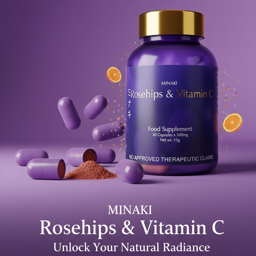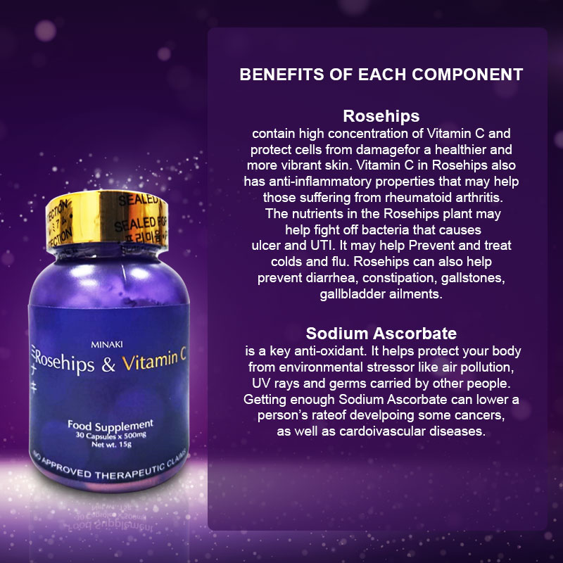 Minaki Vitamin C Rosehips 500mg Benefits : *Increase bone density *Reduces Chances of UTI *Combats cancer *Decrease Hypertension *Cures Cataracts *Treat Colds *Reduces chances of strokes *Prevents Alzheimer’s *Prevents Scurvy *Boost immune system *Make your heart and skin healthy *Gluten free *Alkaline *Non GMO.