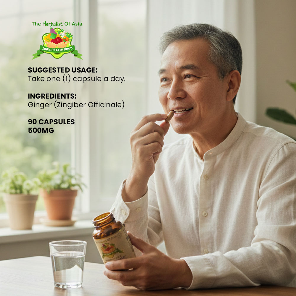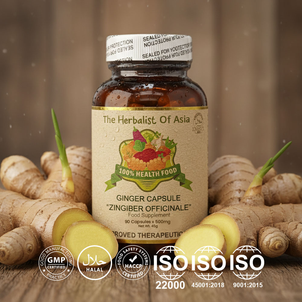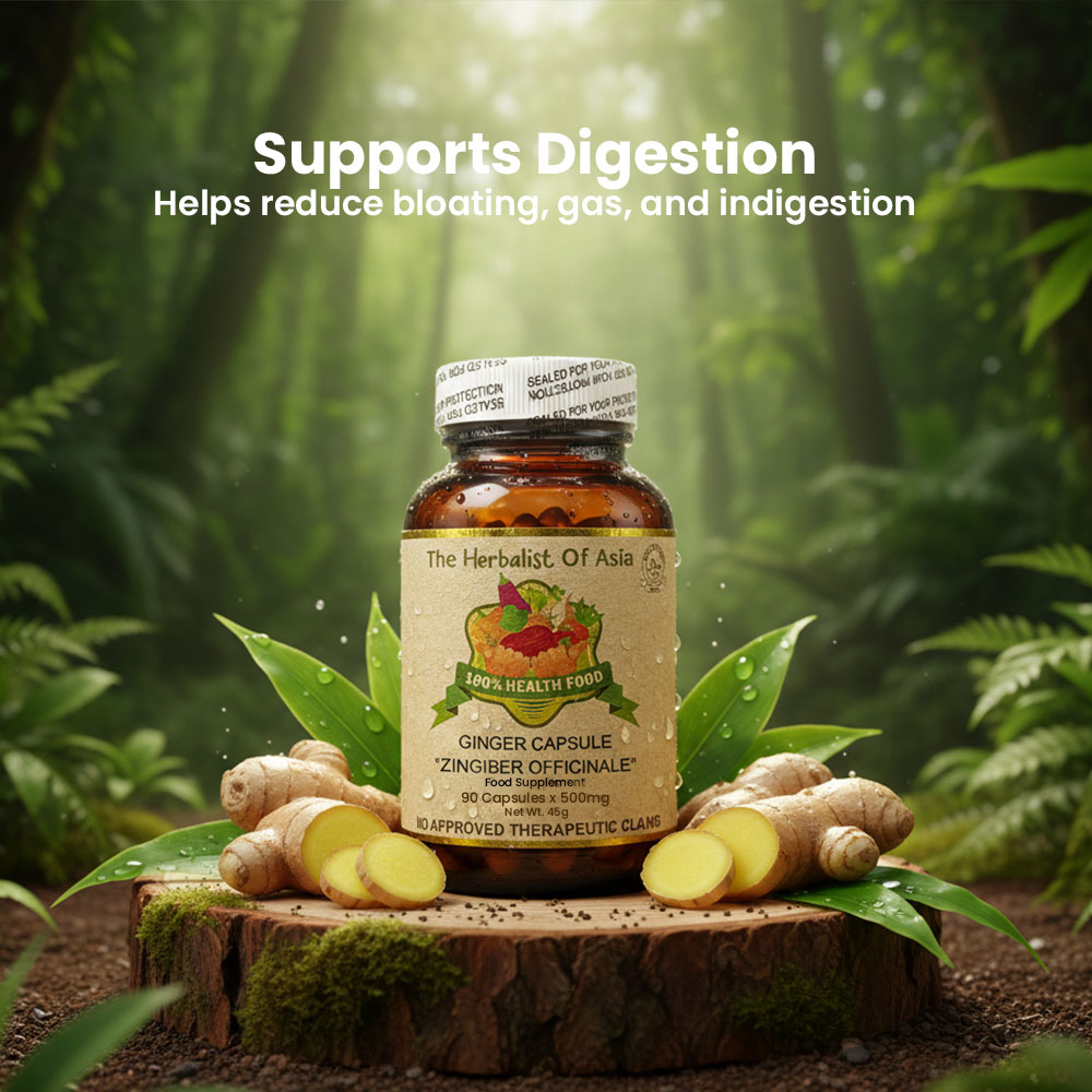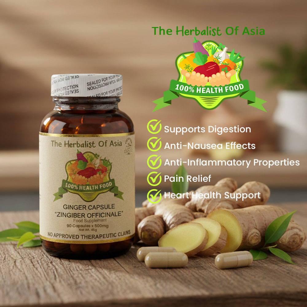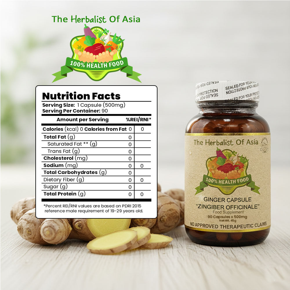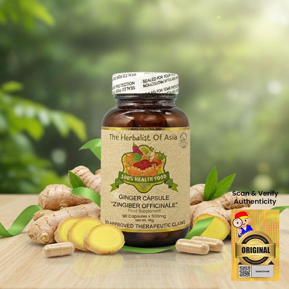 The Herbalist of Asia’s Ginger Capsule is derived from the rhizome of the Zingiber officinale plant, which has been used for centuries in traditional medicine for its various health benefits. Ginger is well-known for its distinctive flavor and aromatic properties, and it is commonly used as a spice and herbal remedy.