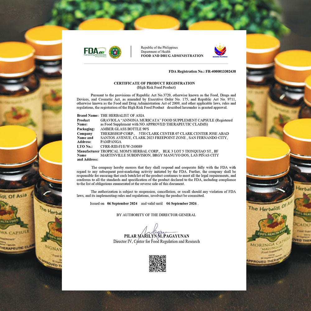 Yes. The Herbalist of Asia Graviola Capsule (“Guyabano”) is registered and approved by the Philippine Food and Drug Administration (FDA).