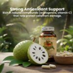 Graviola is rich in antioxidants and natural compounds that help protect the body from oxidative stress. It supports immune health, promotes healthy digestion, boosts energy, and helps maintain overall wellness. It also has anti-inflammatory and antibacterial properties.