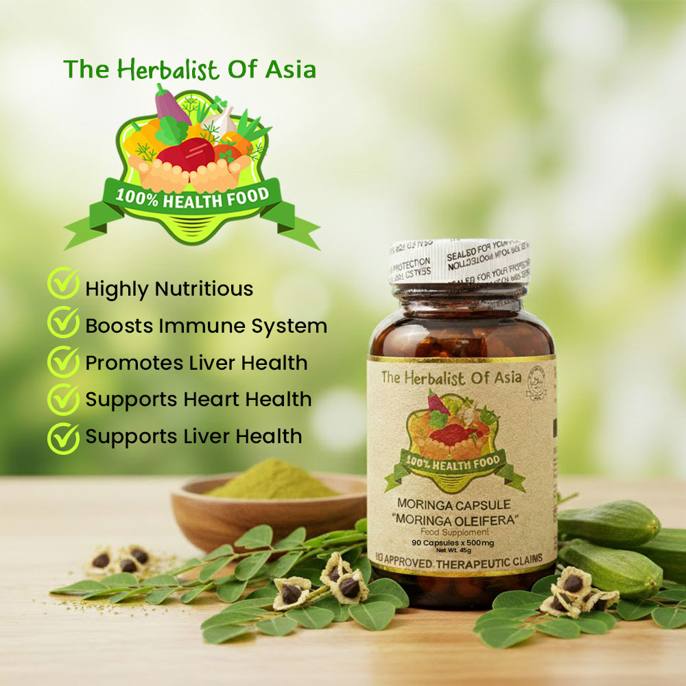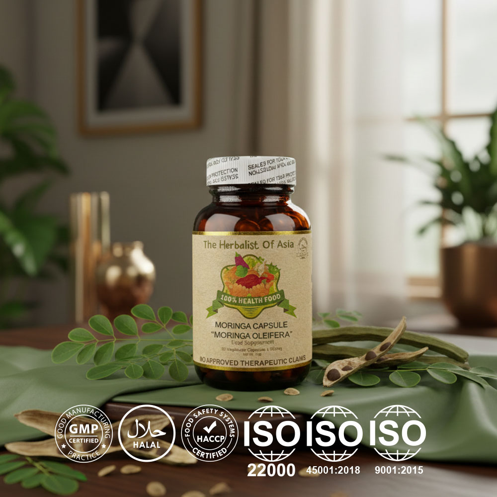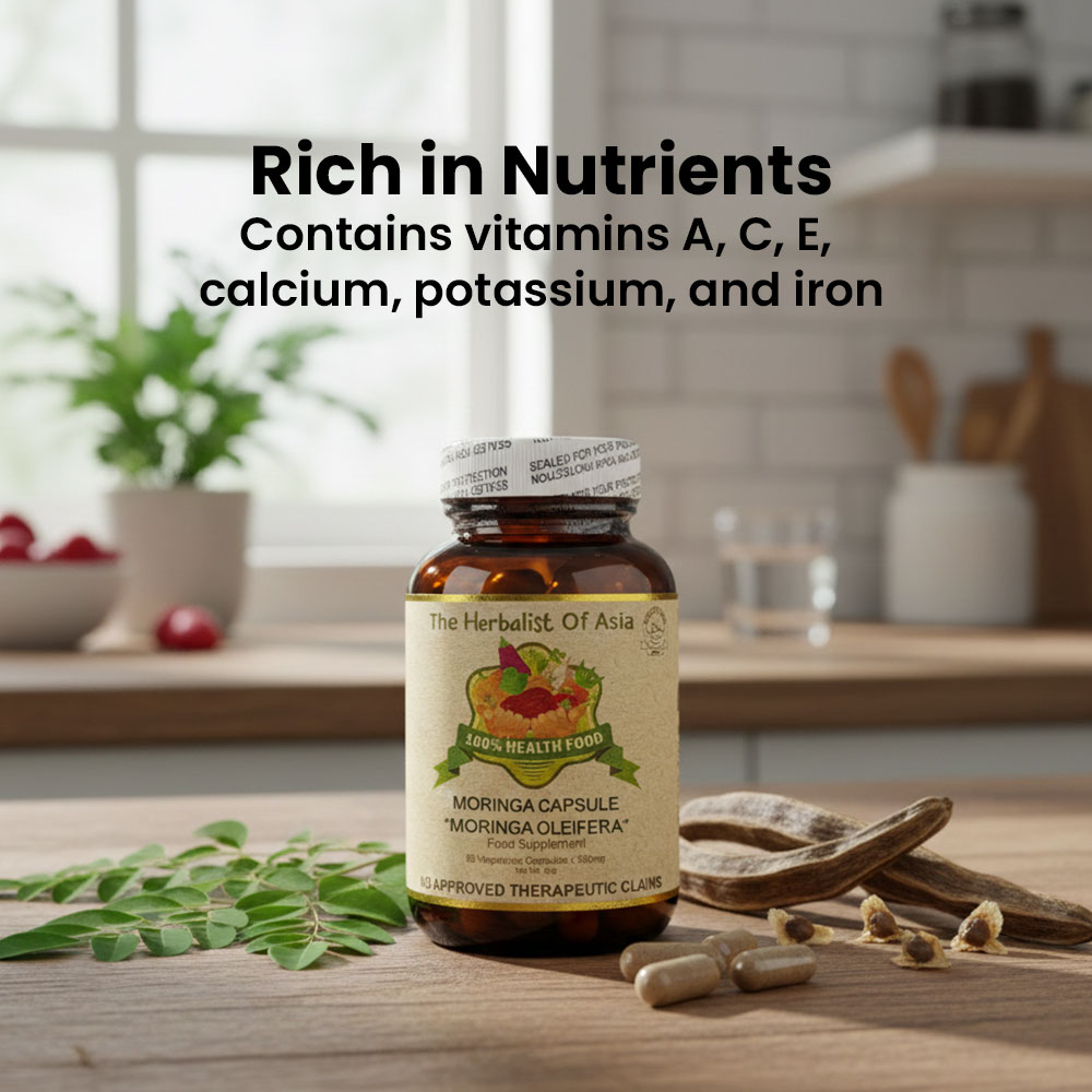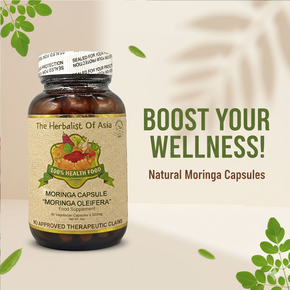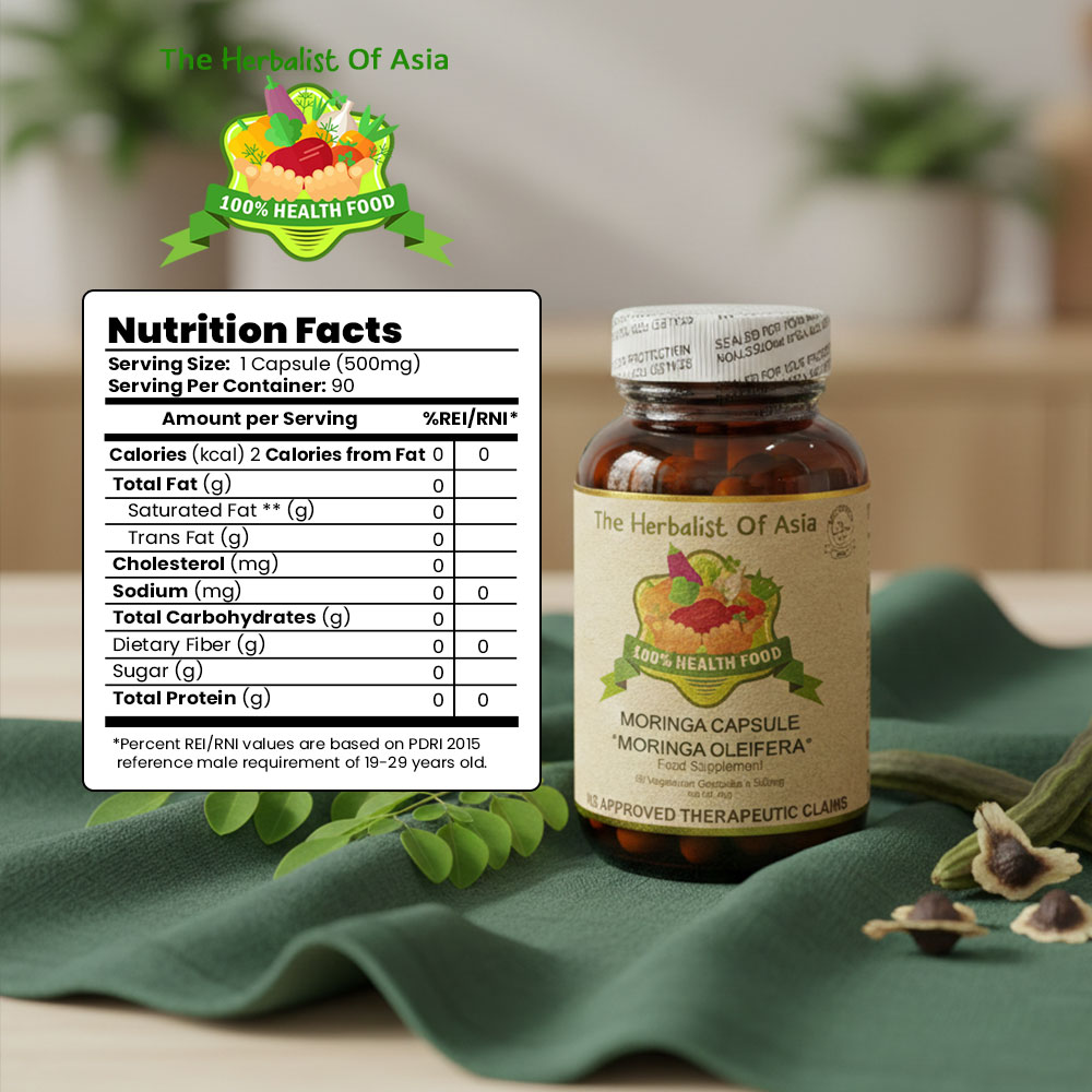 The Herbalist of Asia’s Moringa Capsule is derived from the Moringa oleifera tree, often referred to as the “miracle tree” due to its extensive nutritional profile and numerous health benefits. Moringa is celebrated for being rich in vitamins, minerals, and antioxidants, making it a popular choice in dietary supplements.