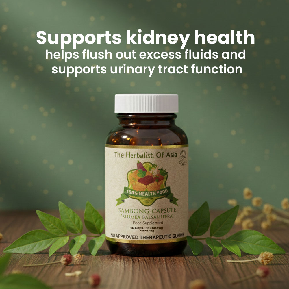 Sambong (Blumea balsamifera) is a natural herbal supplement traditionally used in the Philippines to support kidney and urinary health, promote healthy circulation, and aid overall wellness. Each bottle contains 90 vegetarian capsules made from 100% natural Sambong.